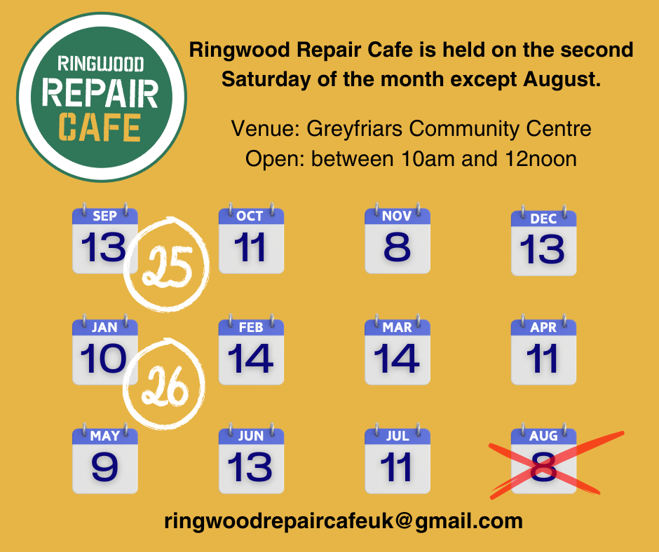 Please use the following link to pre-register an item in need of repair at our event on Saturday 11th October: https://ti.to/ringwoodrepaircafe-uk/11-10-2025. The confirmation email you’ll subsequently receive will provide guidance on how to find us on the day.